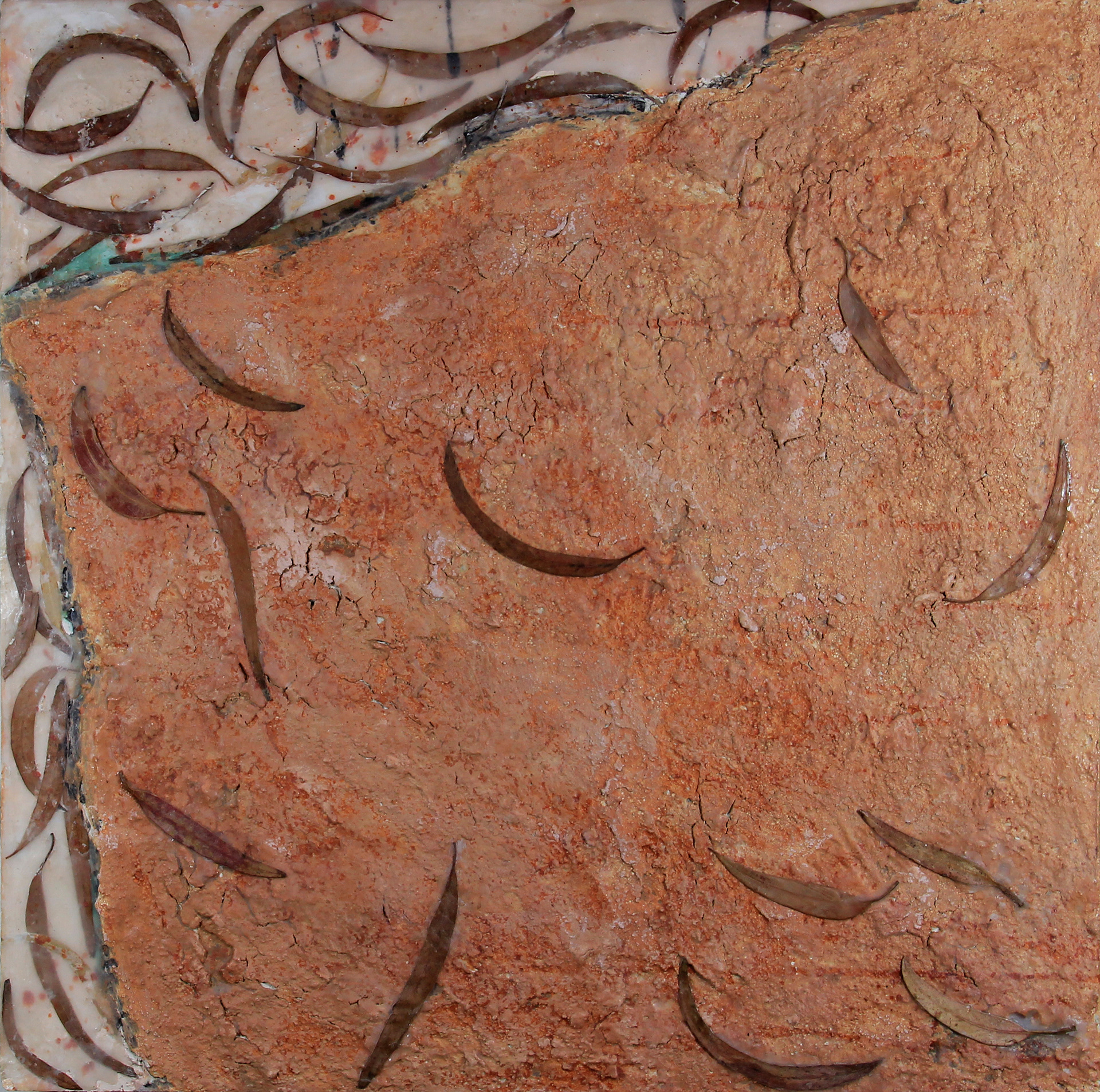 2000 18x18 inches, clay, wax and leaves on panel