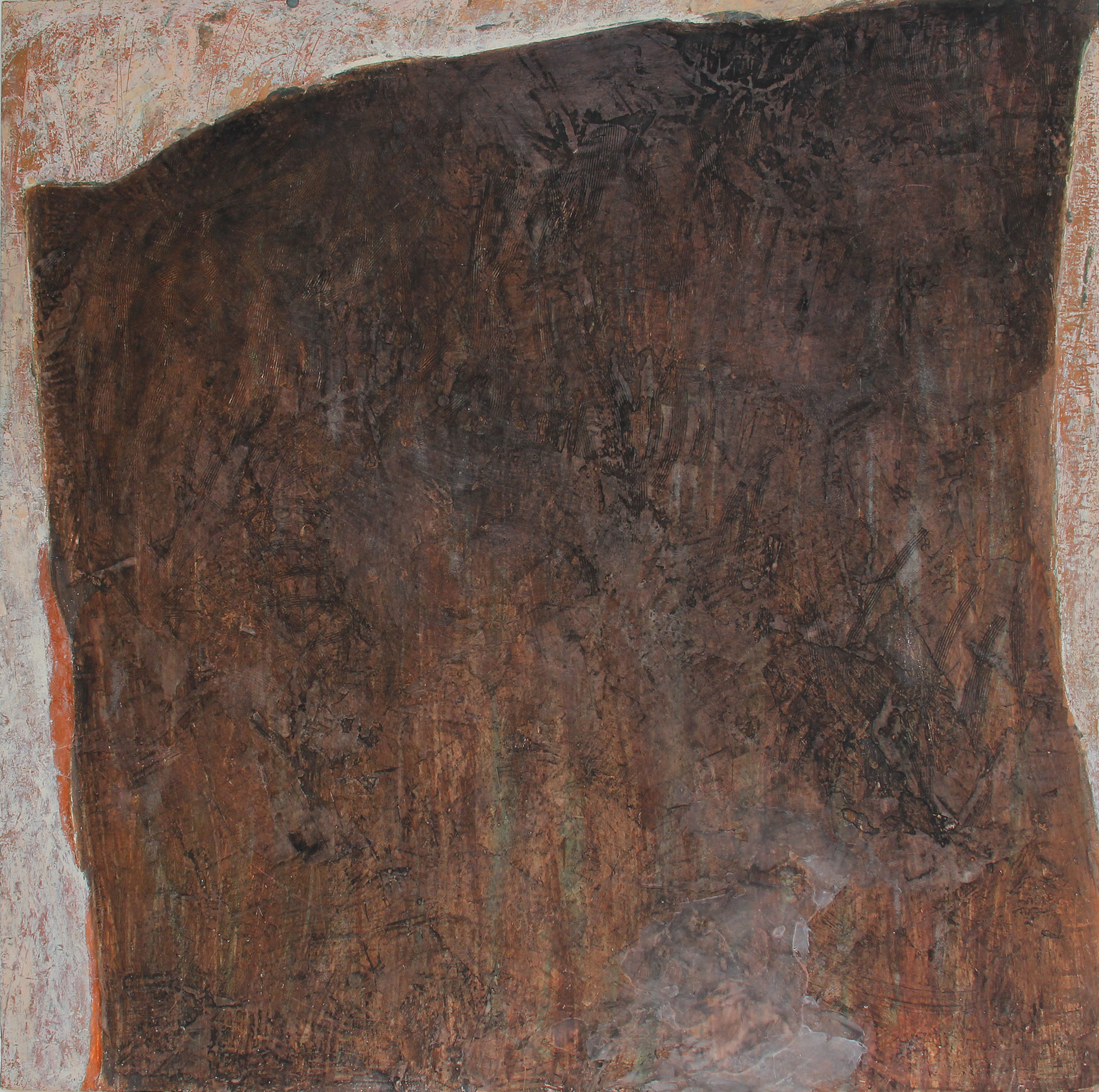 1998 42x42 inches, clay, wax, charcoal, and copper on panel